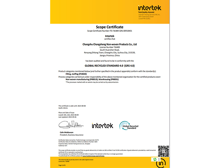 常熟市常盛無紡制品有限公司座落在中國無紡名鎮(zhèn)——任陽鎮(zhèn),擁有生產(chǎn)、倉儲車間11200平方米,通過ISO9001、ISO45001、ISO14001體系認(rèn)證。公司具有15年的無紡產(chǎn)品生產(chǎn)經(jīng)驗,專注于紡絲棉的生產(chǎn)。產(chǎn)品廣泛采用GRS認(rèn)證的環(huán)保材料,通過bluesign藍(lán)標(biāo)認(rèn)證,充分體現(xiàn)環(huán)保可持續(xù)理念和價值觀,與世界500強企業(yè)保持長期良好的合作。